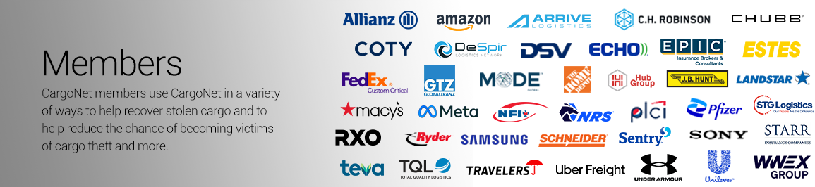 AlertSEARCH - AlertSEARCH provides advanced search functionality for actionable intelligence within the CargoNet database. It can be utilized to directly reduce your chances of becoming a cargo theft victim. AlertSEARCH allows you to search CargoNet's extensive archive of alerts by any suspect name, phone number, email address, and much more. Ultimately, anything you can think of can now be searched and used to help you avoid identity theft, fictitious pickups, other transportation-related scams, and aid in your carrier validation efforts. Learn More