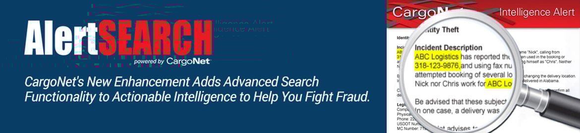 AlertSearch provides advanced search functionality to actionable intelligence within the CargoNet database. It can be utilized to directly reduce your chances of becoming a cargo theft victim. AlertSearch allows you to search CargoNet's extensive archive of alerts by any suspect name, phone number, email address, and much more. Ultimately, anything you can think of can now be searched and used to help you avoid identity theft, fictitious pickups, other transportation related scams and aide in your carrier validation efforts.