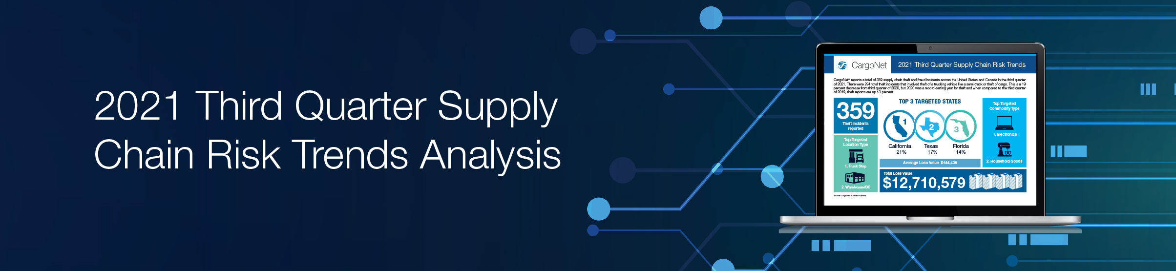 JERSEY CITY, N.J. — CargoNet® reports a total of 359 supply chain theft and fraud incidents across the United States and Canada in the third quarter of 2021. There were 294 total theft incidents that involved theft of a trucking vehicle like a semi-truck or theft of cargo. This is a 19 percent decrease from third quarter of 2020, but 2020 was a record-setting year for theft and when compared to the third quarter of 2019, theft reports are up 13 percent.